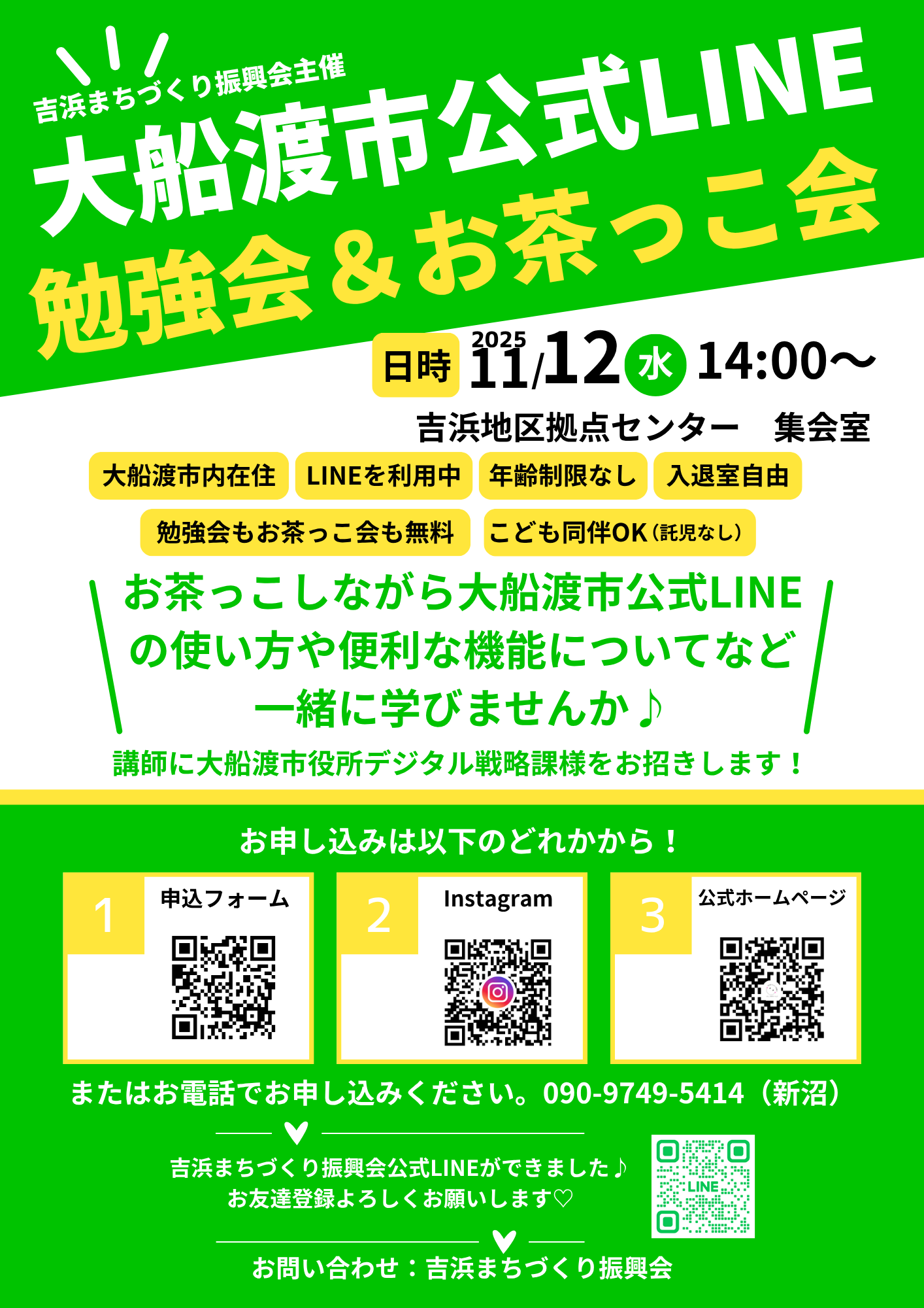 2025.10.17 おしらせ 大船渡市公式LINE勉強会&お茶っこ飲み会に参加しませんか~ 11月12日(水)14時~吉浜地区拠点センターを会場に大船渡市公式LINEの勉強会&お茶っこ会が開催されます!大船渡市公式LINEの便利な使い方を、大船渡市役所デジタル戦略課が講師として直接説明してくれます!まだまだ知らない機能なども知るチャンスですし、日常の困りごとなどをみんなで話すいい機会になればな~と期待しています★参加対象は「大船渡市内在住でLINEを利用している人」ならだれでもOK!ぜひお待ちしております! ← 前の記事へ 一覧へ戻る 次の記事へ →